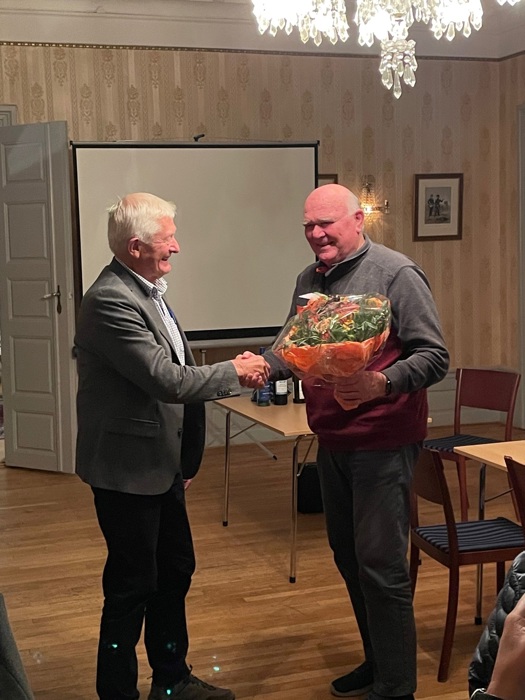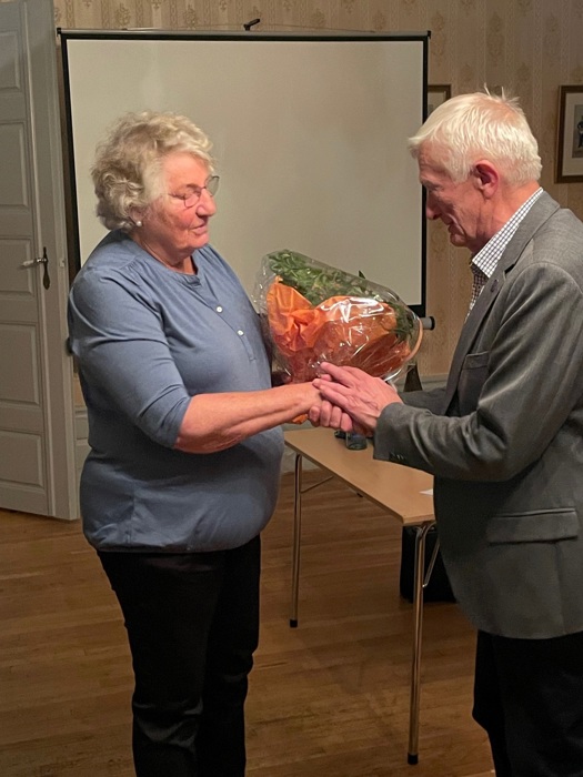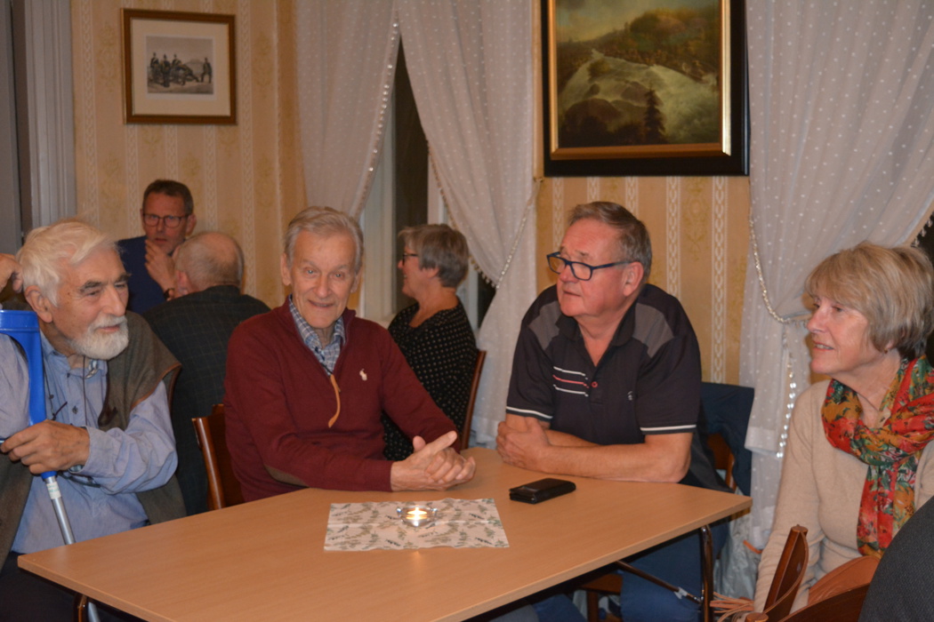 Etter foredraget ble det som vanlig kaffe og kringle med trivelig prat rundt bordene. Ekstra hyggelig denne gangen var overrekkelse av blomster til to 80 års jubilanter som hadde valgt å feire dagen på tur i utlandet.