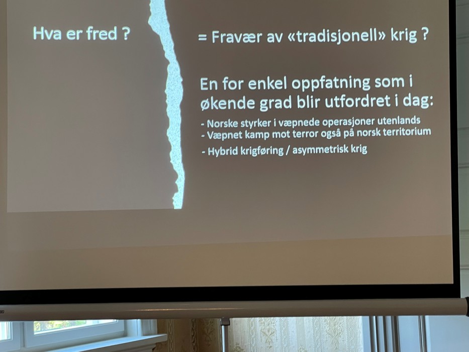 Mange år etter slutten på den kalde krigen har utviklingen ført til at sikkerhetssituasjonen i vår del av verden er betydelig forverret etter Russlands krig mot Ukraina. Muligheten for krig også i våre områder framstår som en skremmende mulighet. Rask oppbygging av det forsvaret som hadde blitt nedbygget gjennom tre tiår har nå blitt høyeste prioritet på den politiske agenda. Hybridkrig og asymetriske konflikter har i betydelig grad endret selve krigsbegrepet. Foredragsholderen, tidligere kommandant Magne Rannestad understreket at forsvarsevne og beredskap ikke bare gjelder det militære forsvar, men alle sider av samfunnet. Han berørte en rekke felter og tiltak som har blitt foreslått av den såkalte totalberedskapskommisjonen, ikke minst minnet han om personlige forberedelser og beredskapstiltak som kan gjennomføres av oss alle.